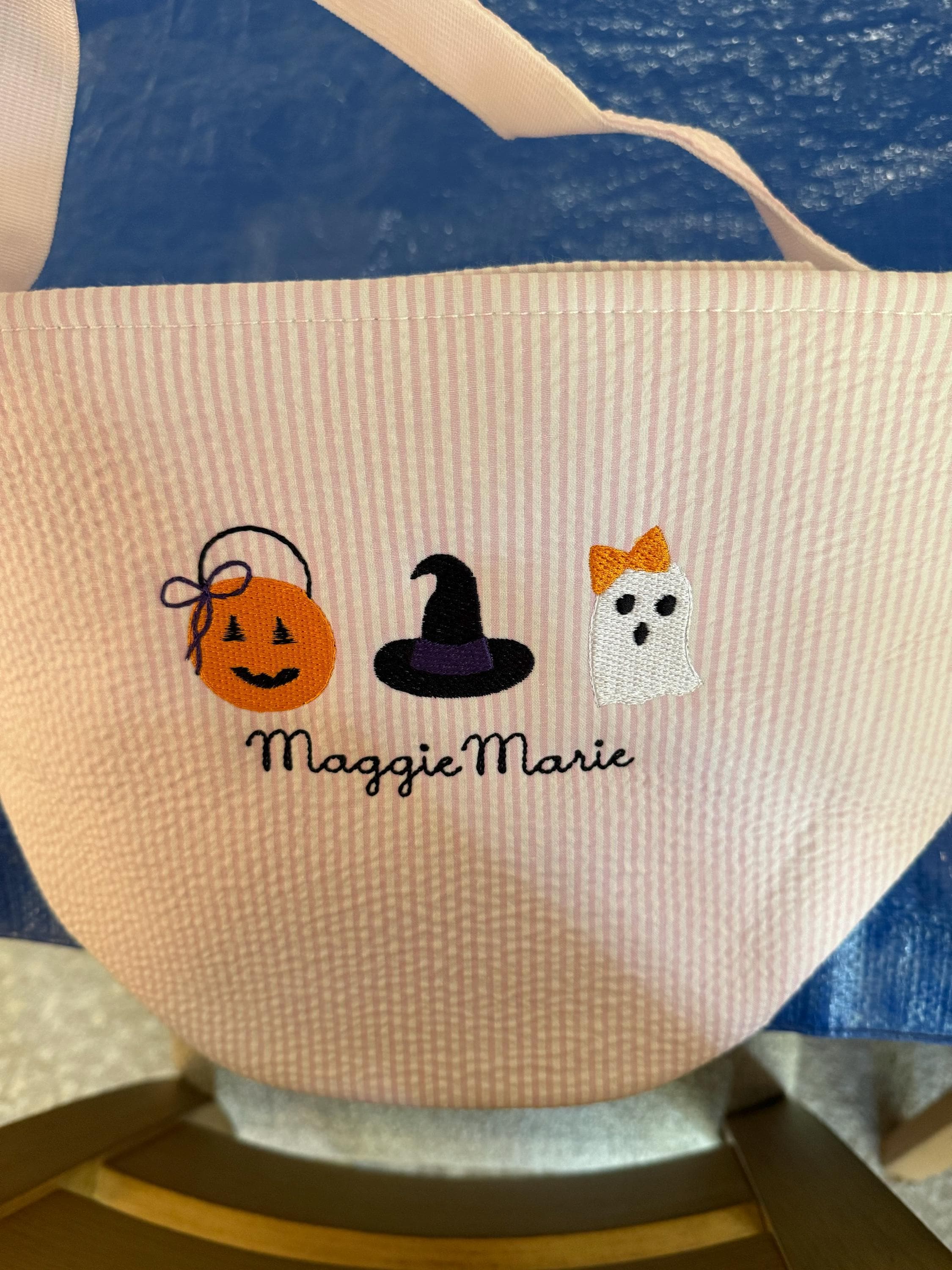 Seersucker baskets comes in light pink, lavender, light blue, and lime green. Embroidered with the Halloween trio and name underneath.
